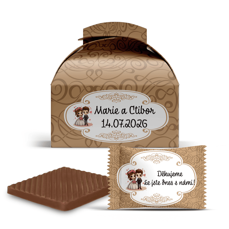 Naše mini čokoládky s vlastním textem v dárkové krabičce jsou dokonalou drobností jako poděkování hostům, výslužka ke svatebnímu stolu nebo sladká dekorace.