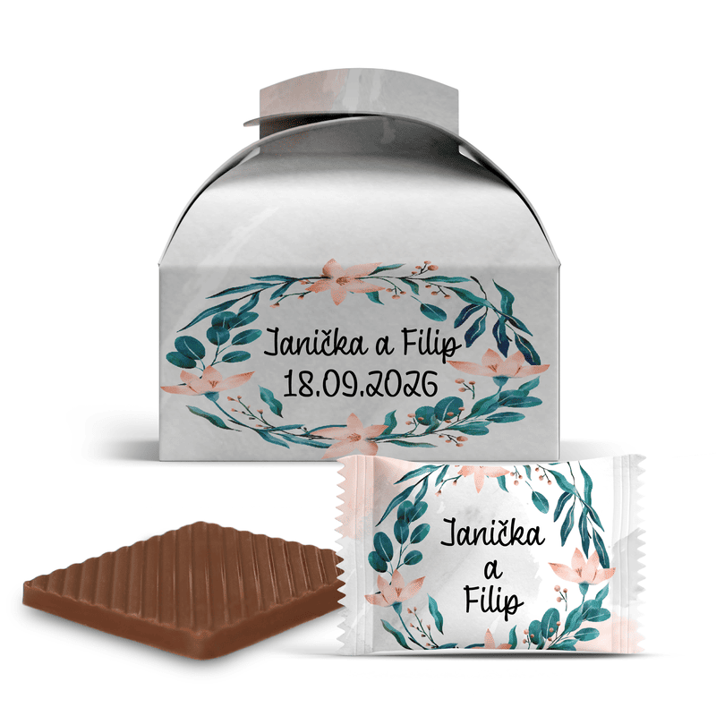 Naše mini čokoládky s vlastním textem v dárkové krabičce jsou dokonalou drobností jako poděkování hostům, výslužka ke svatebnímu stolu nebo sladká dekorace.
