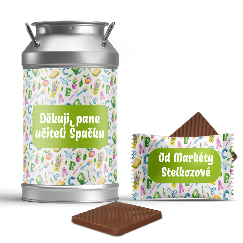 V retro dóze o velikosti 80x145mm najdete výběr mini čokoládek ve stejném motivu a také s vlastním textem jako u dózičky.